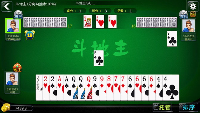 1. 房间系数为 3 ,地主叫 3分,一个农民加倍,一个农民不跟加倍,抽水率10%。