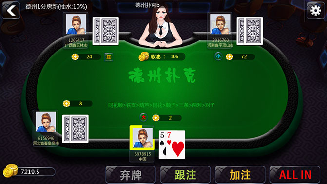 4. 全押:: 一次把手上的筹码全部押上,本站的德州扑克每个房间设有封顶投注,全押就是投注总额达到封顶投注额。